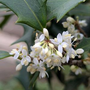 ヒイラギ(柊・疼木・柊木) モクセイ科モクセイ属 とげ状の鋸歯をもつ葉が特徴で、邪気を払う縁起木として生け垣や庭木に良く植えられる また節分にヒイラギの枝に鰯の頭を門戸に飾って邪鬼払いとする風習(柊鰯)が全国的に見られる