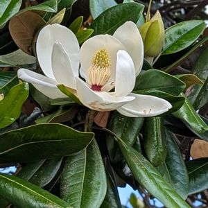タイサンボク(泰山木・大山木) 学名: Magnolia grandiflora モクレン科モクレン属 北米原産 花の形から「大盞木」(たいさんぼく、盞は「さかずき」)とされ、その後「泰山木」の字が充てられたともされる 雄しべが花弁の上に落ちている…昨日、一昨日なら落ちてなかっただろうに…雨だったからなあ🙄