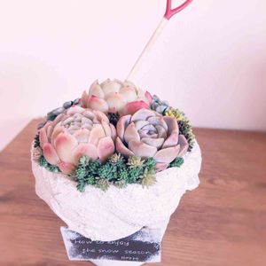 雪かきをイメージしたというはっぺさんの寄せ植えセットが届いたので早速今年の初寄せ✨してみました♪☺︎ スコップの位置が難しくて試行錯誤💦しましたが結局お手本と同じ位置に🤭