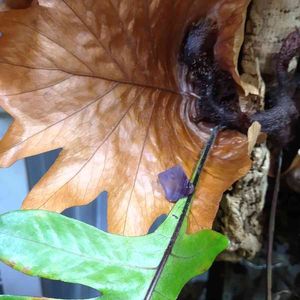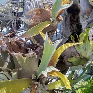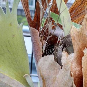 こんにちは。 ビカクシダさんの貯水葉が太い葉脈に成って行ってるんですよね~例年は流木の表面を持って行くだけやったのに…犯人はアシナガバチ~巣を作る素材として今年はビカクシダさんを使っているようです~