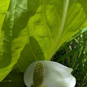 ミズバショウ 葉っぱがワサワサ大きくなります 花が終わってしまうと ただ大きな葉っぱがあるなぁと思うくらいで、ミズバショウとは気付かずに通りすぎると思います