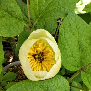 ヤマシャクヤク(山芍薬)の種袋 ひとつ 弾けました😉 【🔍花後に結実すると果実が次第に大きくなり、夏の暑いころに割れて、ザクロのように中の種子がはじけます。この種子は完熟のものは黒く⚫、不稔のものは赤く🔴色づきます。色とりどりでとても美しく、花とともに茶花としても愛されています】 4月末の開花、花は2、3日で散ってしまいます。花姿からはイメージ出来ない種の様子ですね😅
