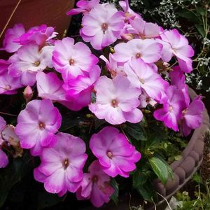 おはようございます(*´∇`*) ニューギニアインパチェンス.·˖*♡ (ラディアンス) こちらは薄いピンクに端が濃いピンクで縁取りされた可愛いらしい花です🥰 大きくなってきました🎵🤗