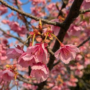 2月、3月(今日まで)に出会った 早咲きの桜🌸Part1️⃣ 品種の多さに、、ビックリ❗️😲♡ パッ!と見たら、みんな同じよう… ジックリと見ると、違いが👀✨ 《スライドpic》 ①ツバキカンザクラ(椿寒桜) 別名・初美人 寒緋桜✖︎唐実桜(支那実桜)の雑種 花は一般的な桜より紅色が強く密につけ、雄しべが長く、花弁は内側に曲がるのが特徴とされます。 ②オカメザクラ(おかめ桜・阿亀桜) 別名・おとめ桜 寒緋桜✖︎豆桜の交配種 淡い紅色の一重咲き、マメザクラに似て小輪、花が下向きにつくのが特徴です。 ③カンザクラ(寒桜) 寒緋桜✖️山桜の雑種 花は淡紅で一重咲、大きさは中輪。 名前のとおり、場所によっては1~2月に咲く早咲きの桜。 ④タイリョウザクラ(大漁桜) 花の色が鯛の色に似ていることから名づけられた桜で、早咲きの大島桜の種子を熱海市営農場で播種、育成した苗から選抜された品種です。 ⑤シュゼンジカンザクラ (修善寺寒桜) 寒緋桜✖︎大島桜の雑種 中輪の一重咲き、静岡県伊豆市修善寺に原木あります。カンヒザクラの系統では最も大きく成長する桜の一つですが、成長は遅いといわれています。 🏷️木曜日は桃色