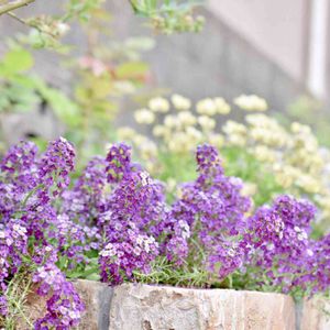 花壇から枝垂れるようにスーパーアリッサムパープルプリンセス💜 秋に植えてずっと咲いています。 冬越しも花壇に植え付けたままで大丈夫でした⛄️ そろそろ花が伸びてきたので一度切り戻しを行いました✂️