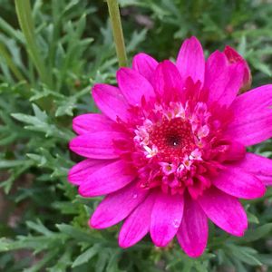 おはようございます🎵 ボンザマーガレット ローズピンク リーフ咲き‼️ 30㎝の少し高さのある鉢に一株植えました🎵真ん丸になり今では直径40㎝になりました☺️ 植えてから2ヶ月半経っています✨ このお花は植えてから摘芯もしていなくて植えっぱなしの手間のかからないお花💠です❗️ 昨年は色違いのレモンイエローのオペラ咲きを購入して今年夏越ししました🎵 もう少しでお花💠たくさん咲きそうです😊 玄関先がピンク色の真ん丸で可愛く賑やかになりそうです✨