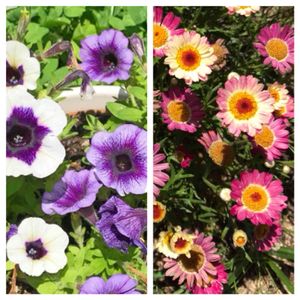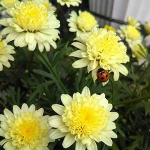 先日も投稿したボンザマーガレット ウルル咲き 咲き進んで、中心の小さい花がどんどん開いていき、さらに進むと花の色がほとんど抜けてしまいます(左)。それぞれ違う花みたいです。 シジミチョウが蜜をすいにきてました。 向こう側の苗はヒメキンギョソウ。まだまだ小さいです😅。ちゃんと育つといいな。
