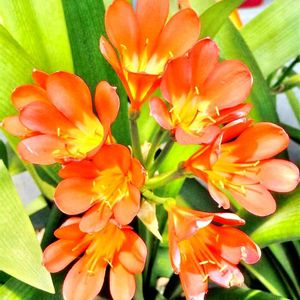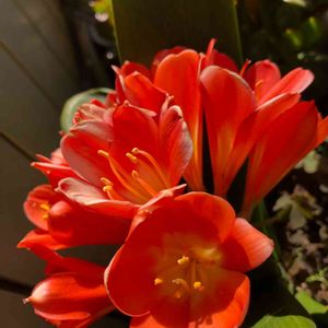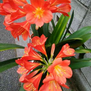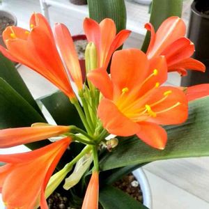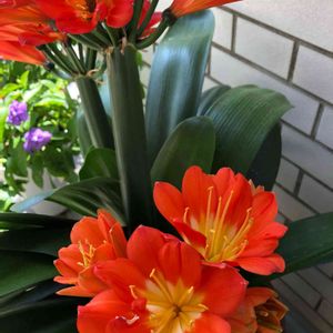 君子蘭の2つ目の子株が初めて花を咲かせました‼️ こちらは義母が植えて、10年位はなるんで、親株に子株が2つ、1つの鉢で所狭しと咲いてます。今年は、花が終わったら株分けして植え替えます。 不安ですが、GSのお友達の「みどりのまとめ」を参考に、頑張ります💪👍