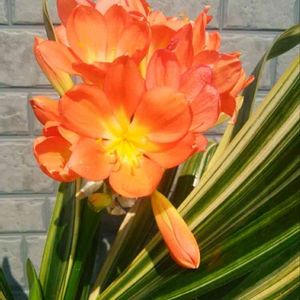 こんにちは! 良い天気で、ビニールハウス内は、34℃です😰 ハウスで、沢山の君子蘭が咲いてます! これは葉っぱ🌿が縞斑、花無い時も綺麗です!