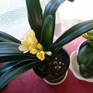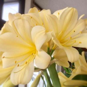 会社玄関の君子蘭 パソコンでチカチカの目👀 クリームイエローの優しいお色に癒されます❤️