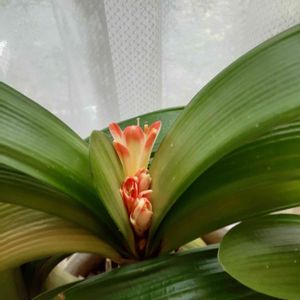 <自道投稿>クンシラン(君子蘭)所定の所に二ヶ月早く置きましたが、無事に花咲か心配と花の先端窮屈状態になってます。見守ります😃一回り葉が大きくなりました👀それに、茎伸ばさず?葉元から直に花🤔見物です😵