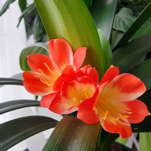 <自道投稿>茎なし「クンシラン・君子蘭」葉の間から窮屈に三輪咲いてます。冬の楽しみでしたが、異常気象😅のあおりかな😅今年は四月に満開😥半年早く😒それも茎なしで😓