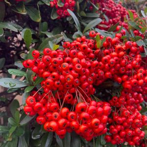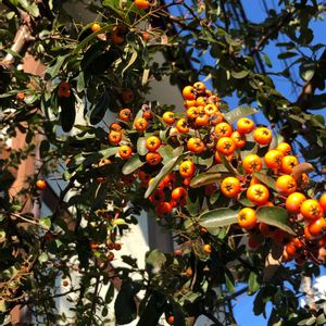 オレンジ色の実のトキワサンザシ🍊 「トキワサンザシは赤い実、タチバナモドキはオレンジの実」って思っていた。 よく見ると葉っぱが違うから分かったけど…オレンジ色のもあるんカーイ✋💥紛らわしい〜😂 おっと、ツッコミ張り手したくとも棘があるわ🪡😱 《ノート》 ドイツ名Mittelmeer-Feuerdorn (学名Pyracantha coccinea) 南ヨーロッパ原産で記録上では少なくとも17世紀にはヨーロッパ中部にも紹介され、イギリスでは18世紀には既に生垣として一般的だったらしい。