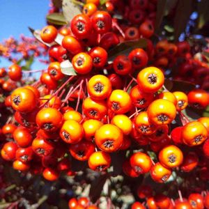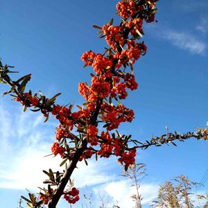 トキワサンザシ バラ科トキワサンザシ属 上向きの枝が空に向かい立ち上がっています。 扁平の球形果実は鮮やかな紅色です。 冬の青空に紅色が映えますね。