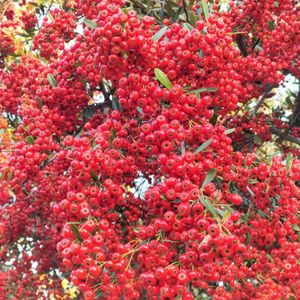 赤い実がたわわっ✨ ピラカンサ ギリシャ語のピル(炎)とアカンサ(刺)からついた名前だそうです✨ 英語でも「Firethorn(炎のトゲ)」なんかカッコいい✨ 花言葉 「燃ゆる想い」「美しさはあなたの魅力」「防衛」だそうです。 真っ赤な実からの花言葉なのかなぁ… 素敵ですね。 自分に負けないように✨