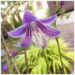 ホスタの花 花茎が伸びすぎで、こんにちはしすぎるから、シマトネリコの樹に、麻紐で今朝くくりました。なので、写真も撮りやすい。ただ近隣が写るからあれこれ撮り直し(*^◯^*)