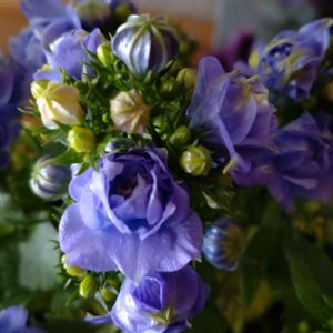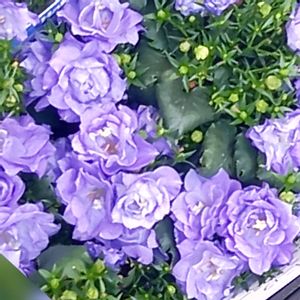 【カンパニュラブルーライクミー】 《キキョウ科》 花言葉 「感謝」「誠実な愛」「共感」「節操」 「思いを告げる」 カンパニュールという精霊が黄金のリンゴを守っていると、リンゴを奪おうと果樹園へ侵入した一人の兵士に命を奪われます。 彼女の死を悼んだ女神フローラは、鐘の形をした花に彼女を変えた、 といったギリシャ神話からこれらの花言葉がついたそうです。 💜紫のカンパニュラの花言葉は 「大望」「抱負」 種間交雑によって生まれた大輪の八重咲きカンパニュラ 青いバラのような豪華な花。