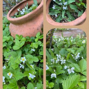 いつのまにか(*≧∀≦*) 勝手に増えてコラボしている ワイルドストロベリー🍓と、 白いスミレ💕 壺型鉢は、以前はタイムがあった気がした いつの間にやら すみれに占領されたらしい😅 まあ、かわいいからいいか😊💖