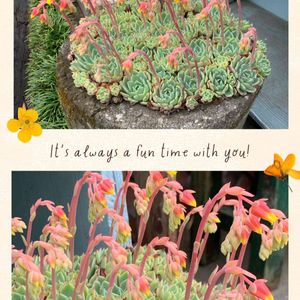 皆同じ方見てる👀 私には,フラミンゴの様に見える🦩 名前は、なんだろ? 冬の寒さにも耐えるし、勝手に増えるし、丈夫な子ですね🌱 エケペリア,エレガンス と教えていただきました。 ありがとうございます😊