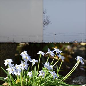 〓午前の投稿便🚚〓 <降参✋😖✋> 前評判通りの黄砂🤷 こりゃ降参(黄砂ん)✋😑✋🔫😂😂😂 ↖️ 北の空👀‼️ ↗️ 西の空😲‼️ ⬇️ 水門川周辺に自生?する 可愛いハナニラです( ´,,•ω•,,`)♡😍😍 どちら様も黄砂! 洗濯物にはご注意を⚠️🤗⚠️