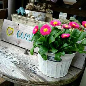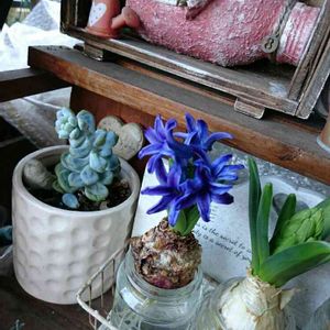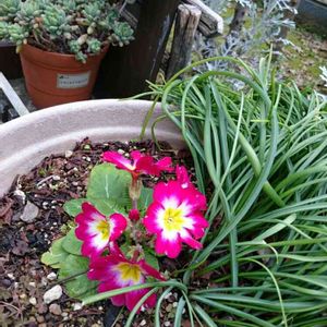 わっさわさのムスカリの葉におされながら、一昨年の寄せ植えしたジュリアンが咲いてくれました♪
