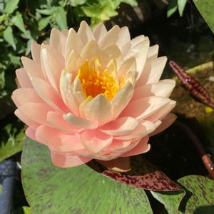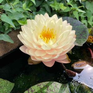 今期導入したもう一種の睡蓮も開花( ^ω^ ) ブラッシングブライドです(*≧∀≦*) 初花なんで小さな花(それでも12cm)ですが、花弁が多くて見応えありますね(〃ω〃) 残念なのは次の蕾が無い… しばらくお休みかな…