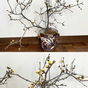 蝋梅が折れた🥺 年明けのご挨拶投稿してから 諸々の疲れがどっと💦 植物観察もサンルームのみで庭にも全く出ておらず、松の内も過ぎようやく出て母とあれこれ見ていると… 母が蝋梅の枝をボキッと😱 古いせいか温暖化のせいか???葉が落ちないまま咲き出すので枝に手をかけ葉っぱを摘んでいて💦💦💦 一気に半分近い枝が無くなりました😂 折れた口を見るとほとんど枯れ色 その僅かに生きた道からよくこれだけの蕾を付けたと驚かされました 切り口を少し落とすと生きた部分が多くなったので蕾のない枯れ枝を整理して、母に上手く活けてもらいました 鉢カバーと母が言いますがワインクーラーです🤭 翌日には蕾がいくつかふんわり開き始め 近付くとほんの少し香りも感じます✨️
