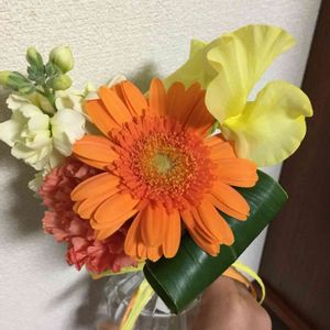 娘が仕事帰りにお花を買ってきてくれました😊 オレンジのガーベラも黄色のスイートピーも好き💕