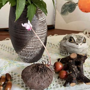 夜分に失礼します|´-`)チラ 気がつくと夜中になっている毎日です💦 原種シクラメン 球根を購入して、ただ置いていたら花芽が出て伸びてついに開花 わーん😂ごめんよぉ〜💦 慌てて鉢に土を入れグググッと鎮座していただきました🎶 古くて実りのわるい鉢植えの姫リンゴ 今年はチビサイズが2個🍎収穫 母が散歩で拾ったどんぐりと一緒に秋の世界を作ってくれています🎶 睡魔でフラフラなのでおやすみなさい🌕✨️ 明日見たらなんじゃこりゃわー