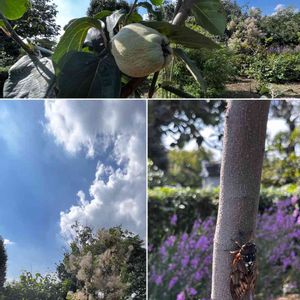 従兄弟の庭にて テンション爆上がりの夏😆 マルメロの木に止まるセミとマルメロの実 スモークツリーからモクモクと昇るような雲☁️😚🎶