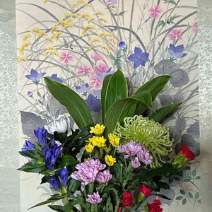 お彼岸の入りに母が仏壇に供えた仏花💐 祖母の掛け軸の前に移動して撮影📱 ちょっと暗かったですね😅 仏花の中に入った葉っぱに ロックオン!!(`・д『+』 奥の葉っぱコルジリネかドラセナか? 🤔根っこ出るんじゃない? ( ≖͈́ ·̫̮ ≖͈̀ )ニヤリ 仏壇の祖母や父に聞かれないように母とコソコソ(。ノ•ω(*´ω`)コソコソ(笑) お供え物を狙う母娘😁