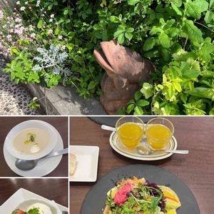 お友達とランチ🍽 先日に母と行ったお店の話をすると「行きましょう〜」となり、再びガーデン🌳も見れました😊 🐸ちゃんの置物 前回は注目してあげれなくてごめんね😚 今回はサラダランチ🥗🥖🍨☕️ たくさんの生野菜とマリネやテリーヌにチキングリルものっていて大満足 はちみつジンジャードレッシングも︎👍🏻 ̖́- ドリンクとプチデザートのヨーグルトアイスでさっぱりしておしゃべりも弾みました🤭