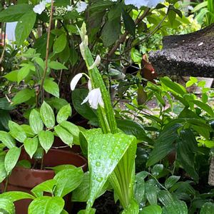 GSを始めて丸8年 9年生になりました✨️ 😳自分でもびっくり🍃🌿🍀☘ 皆さんのお陰で続けられています これからもよろしくお願いします (⋆ᵕᴗᵕ⋆)"☆*ペコ 池に鉢ごとドボンのカラー 今年の初開花です