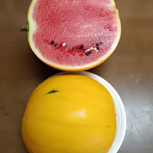 黄色いスイカ 👏👏👏☺️🤗🥰 情報では知っていたのですが「本物」を初めて見ました。 農協の物産館で😲😮🙂 即買い物カゴに入れていました。・・・ 味? 気になるでしょう??? その味?は 緑色のスイカとあまり違いはありませんでした。 ちょっと期待・・・ していたのですが・・・ 今年猛暑の中でのハプニングでした。 (*^-^*)(*^_^*)(*⌒▽⌒*)