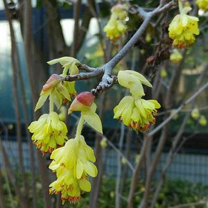 トサミズキ(土佐水木) マンサク科トサミズキ属の落葉低木 高知県の固有種(四国の蛇紋岩地帯に自生) 名前の由来:自生地が土佐で、枝を切ると水気が多いことから。 全国に植栽されている。 株立ち性 花期:3月~4月 緑地公園のトサミズキ。 5弁の花が、いくつかまとまった形で、ぶら下がり、温室の玄関前を飾っていました。 マンサクやサンシュユよりも、花の色が薄い黄色です。 花が終わると、波状のギザギザの葉が出てきますが、花殻は、今も、少しだけ、残っていました。