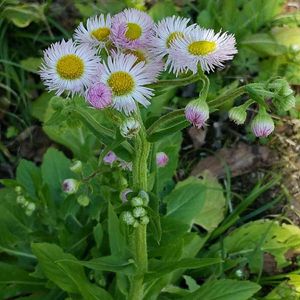 ハルジオン(春紫苑) キク科ムカシヨモギ属の多年草 北アメリカの帰化植物(大正時代に園芸植物として輸入したものが戦後、各地に野生化した) 名前の由来:秋に咲くシオンに似て、春に咲くことから。 道端や空き地などで、よく見かけますが、このハルジオンは、緑地公園の桜の園の中にありました。もう少ししたら、桜の花の下で見上げているのかな~(’-’*)♪ 蕾の頃は、花序が下向きに垂れるのが特徴とのこと。元気がなかったわけではなかったのですね~(^.^)