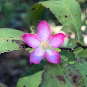 春にたくさんの花を咲かせていたニワウメ🌸 実もすっかり落ちてしまったこの時期にポツポツと花が咲いていました🌸 来年の花芽が出る頃…待てずに咲いてしまったのかな?😅 十月桜の木の下で❣️