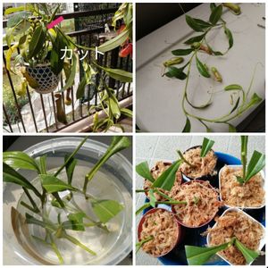 ネペンテス アラタ狂氣令嬢「ヒスイ」の挿し木 温かくなったので少し早いけど挿し木にトライ! ↖️伸びた茎をカット ↗️葉っぱの半分以上をカット(捕虫袋なくなります😢) ↙️発芽点がある葉の付け根を残し何本かにカット。メネデール水にどぼん。 ↘️鹿沼土に挿し乾燥防止のため上にミズゴケ。 しばらくは部屋の中で腰水、プラスチックのカバーをかけて保湿。発根して欲しいなぁ😆~