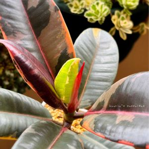 フィカス ルビー✨🌿✨ 新葉の赤い葉っぱが綺麗なのはもちろん、時が経った葉っぱも、油絵みたいな斑入り模様が魅力的😄💕