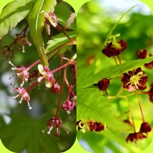 🌿イロハモミジ🌱 イロハモミジは雌雄同株。 一つの花序に雄花と両性花が〜6mmの小さな花を複散房花序に10〜20個つける。花序には短い軟毛が散生する。花弁と萼片は5個。雄しべはふつう8個あり、花からつきでる。葯は紫色。両性花の花柱は先が2裂し、外に曲がる。