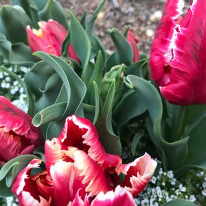チューリップ🌷ディージェイ・パーロット 動きがあって、表情のあるチューリップ♥️ スイートアリッサムは秋に種まきしたもの。 やっともりもりになりました😊