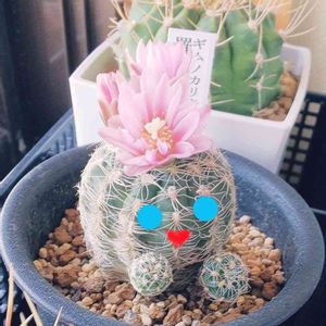 羅星丸、開花しました😍 かわいい😍💕💕 子株が両手に見えたので、目と口を加工してみました😁 黒い瞳よりは、ブルーな瞳が似合う気がしたので、フランス人形ちっくに☺️