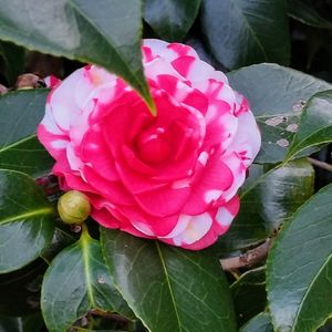 早咲き椿の菊冬至になります。 秋から咲く椿はシンプルな花が多い中、 斑入りの千重咲きは貴重です。 他の椿も徐々に蕾が膨らみ始めました。 冬になると開花が慌ただしくなるので、 一つの樹をじっくり楽しめるのも 早咲き品種の良いところですね。