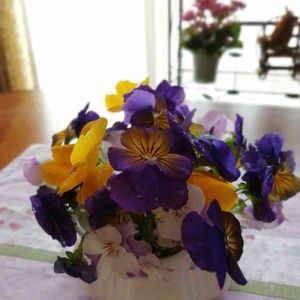 我が家のビオラを切り花に。 虫に食われたようにギザギザに。夜中に懐中電灯持って確認にいくとやはりナメクジでしたヽ(`Д´)ノプンプン。