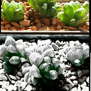 おはようございます☀️✨ 今日はみんなお休みだからゆっくり寝たかったのだけど普通の日より早起きしてしまい、すごーく損した気分😭(笑)早起きついでに涼しいうちにと一気に水遣りしました🌱🚰✨蒸れが怖いけどシワシワになりかけてる子も居たので勇気を出して(ง •̀_•́)ง✨ 諸先輩方々、この時期の水遣りはどのくらいのペースでされていますか?本や、買った時に付いてる札には10日~2週間に1度、土が乾いたら…と書いてますが、それでは多い気もしていて💦アドバイス頂けたら幸いですm(_ _)m picは「ハオルチア・玉露」です。5月に迎えました。お花も咲き終わり2、3日前にチョッキン✂️しました。姿が乱れてるのでよく見ると子株が😍♡前に迎えたハオルチアは焦がしたり徒長させたりと散々な目に合わせてしまったので玉露さんは同じ失敗をしないようにと気を付けていたので嬉しいです💕