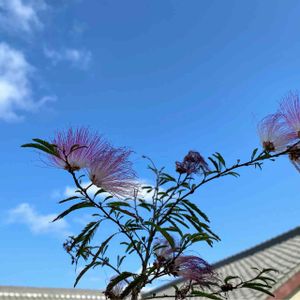 オープンガーデンをしているご近所さんのお庭にて♡大好きなねむの木の花。青空をバックに♡