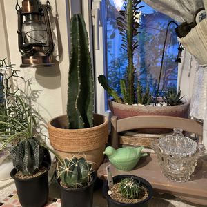 おはようございます サボテンの寄せ鉢 🌊ビックウェーブ🐳 1️⃣ 冬はビニール巻いてお外でした 順調に育ってくれてます 2️⃣ キャー‼️🟤茶色🙈 脱落者一名💦 3️⃣ 何を植えてもうまくゆかない スノーマン☃️ セダムを植えました 日当たりが悪すぎてボーボー 少し日当たりに出し☀️💨 似たもの同士シャビーな ホースリールの目隠しに 🪄🧙✨🪴🌀