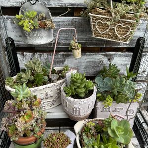 おはようございます 1️⃣ 小さな寄せ植えの多肉棚 ほんの少し徒長?しておりますが みんな元気にしております 2️⃣ ペットボトルツリー🎄 バランスが崩れてきました 夏が終わりましたら手直しを❣️ 3️⃣ ふふふ🤭 働き者のお針子さん しっかりステッチをチクチク🪡🧵 リトルミッシー増えております🧺 4️⃣ 土の部分が隠れてきました 🎋の先に吊るされた🪣 極小ですが何年もカワイイままです🥰 5️⃣ 茶こしリースにバード鉢 アップルフラワーがお子さまを増やしてカワイイの~🍏🍏🍏