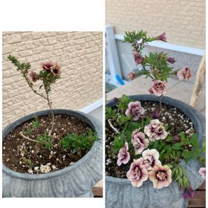 今日も曇り☁️ 蒸し蒸し暑いです(*´ー`*) 今年はペチュニアに挑戦その4 向かって右側、5月の半ば横浜イングリッシュガーデンに訪れた時にガーデン内の小さなショップで見つけて2苗連れてきたペチュニア すぐに植え付けなかったためか1つは枯らしてしまった(´༎ຶོρ༎ຶོ`)気に入っていたし、高かったのに〜 向かって左側は3年目のミリオンベルプチホイップ代わりに寄せてみました。 ペチュニアは葉っぱが少し白いしみが入りお花は中々モリモリにはならず、 ミリオンベルは木質化して長い茎?幹?の先に葉っぱと花がついていてバランス悪い(^^;; どちらも好みの素敵なニュアンスカラー✨ なんとかいい感じになってほしいなぁ*・゜゚・*:.。..。.:*・'