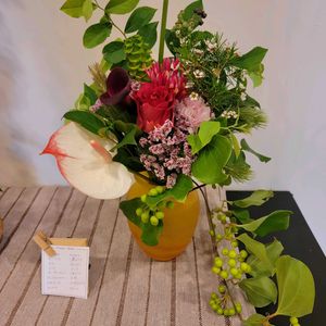 おはようございます👋😃 お出かけ先の生け花 撮影🤳5月23日 1️⃣サルトリイバラ みどりのツル🌿 2️⃣クルクマ 🔍👓クルクマの和名は、ハルウコン、キョウオウ、またはウコンです。クルクマは、ショウガ科ウコン属の植物で、食用や薬用として栽培されるもの(ウコン)と、観賞用として栽培されるもの(クルクマ)があります。 3️⃣カラー 4️⃣ワックスフラワー HBチース 5️⃣ガーベラ❤ バラ🌹 カーネーション🩷